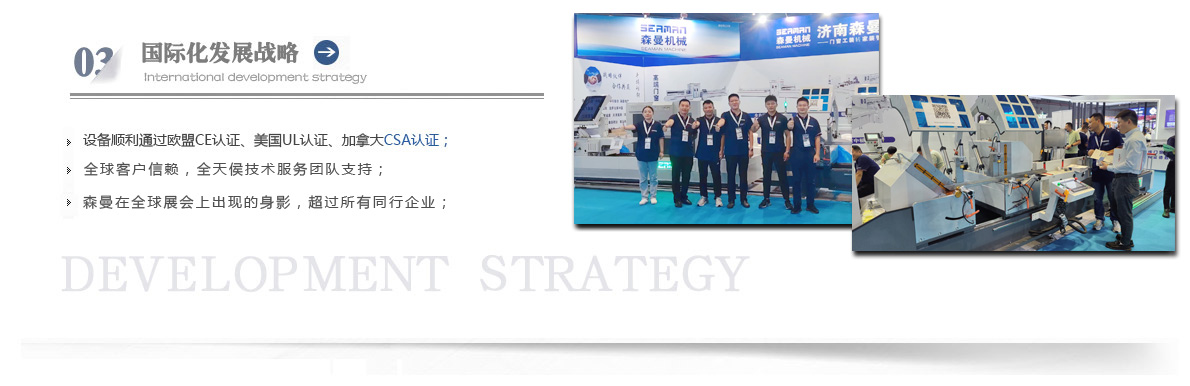 “森曼機(jī)械”作為全球門窗設(shè)備供應(yīng)商,本著"seaman"精神,勇立潮頭,拼搏創(chuàng)新,以爭(zhēng)做行業(yè)為目標(biāo),在行業(yè)前輩發(fā)展的基礎(chǔ)上,努力學(xué)習(xí),積極進(jìn)取。目前公司產(chǎn)品涵蓋塑料門窗設(shè)備、鋁合金門窗設(shè)備、鋁幕墻設(shè)備、鋁木復(fù)合門窗設(shè)備及中空玻璃設(shè)備五大種類,近百個(gè)品種。公司產(chǎn)品銷售至全國(guó)各地及東南亞、非洲、東歐、北美等幾十個(gè)國(guó)家和地區(qū)。在這個(gè)競(jìng)爭(zhēng)激烈的年代,我們正努力使我們的產(chǎn)品!